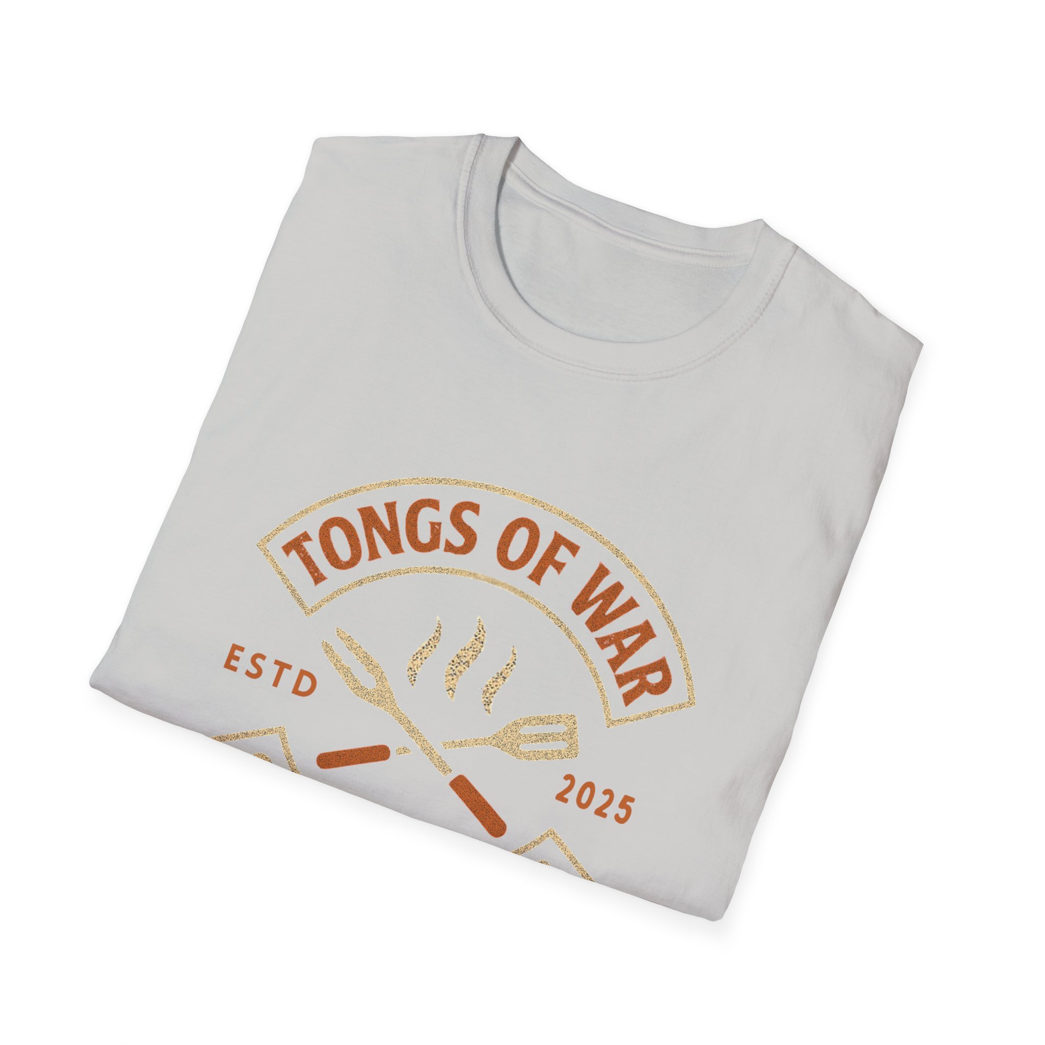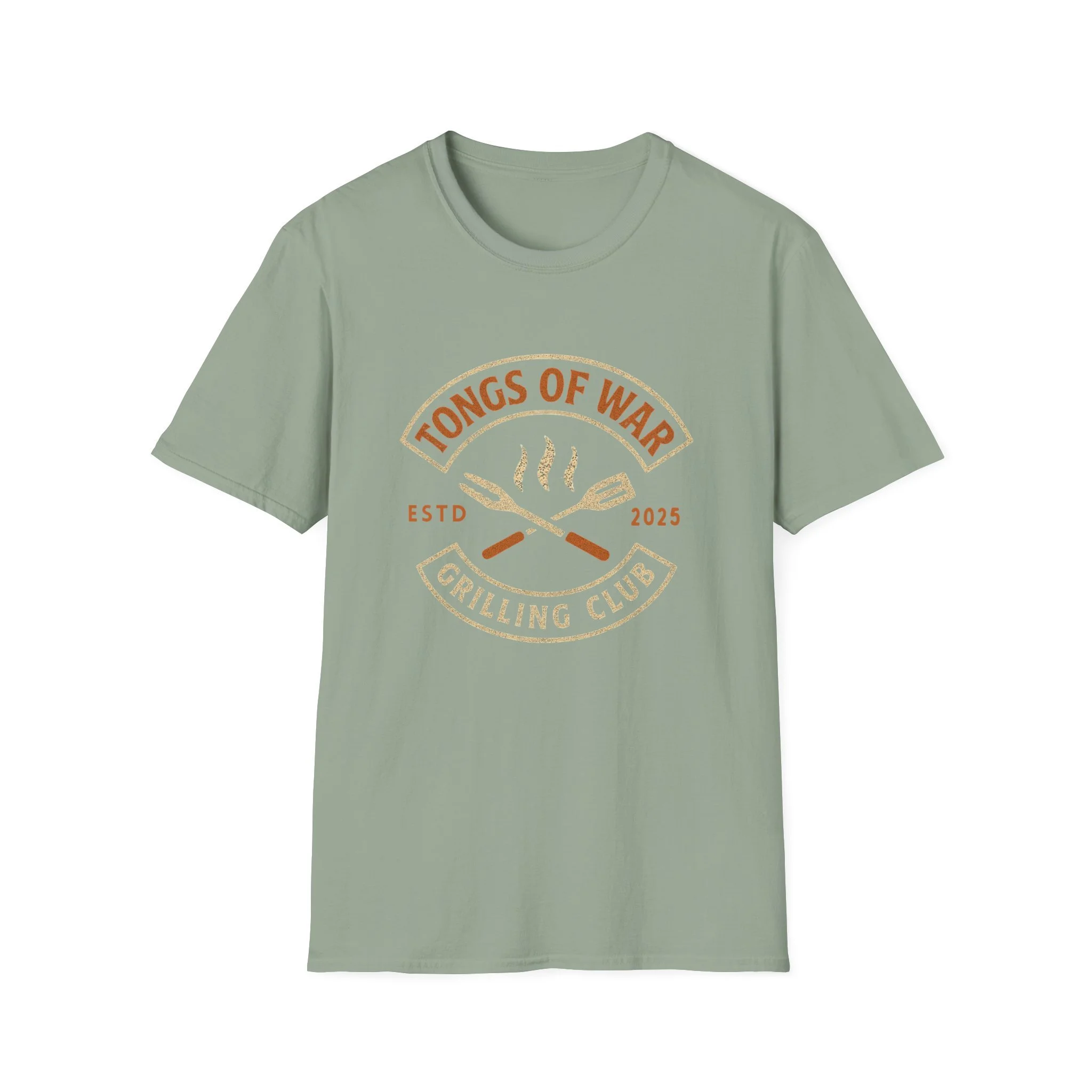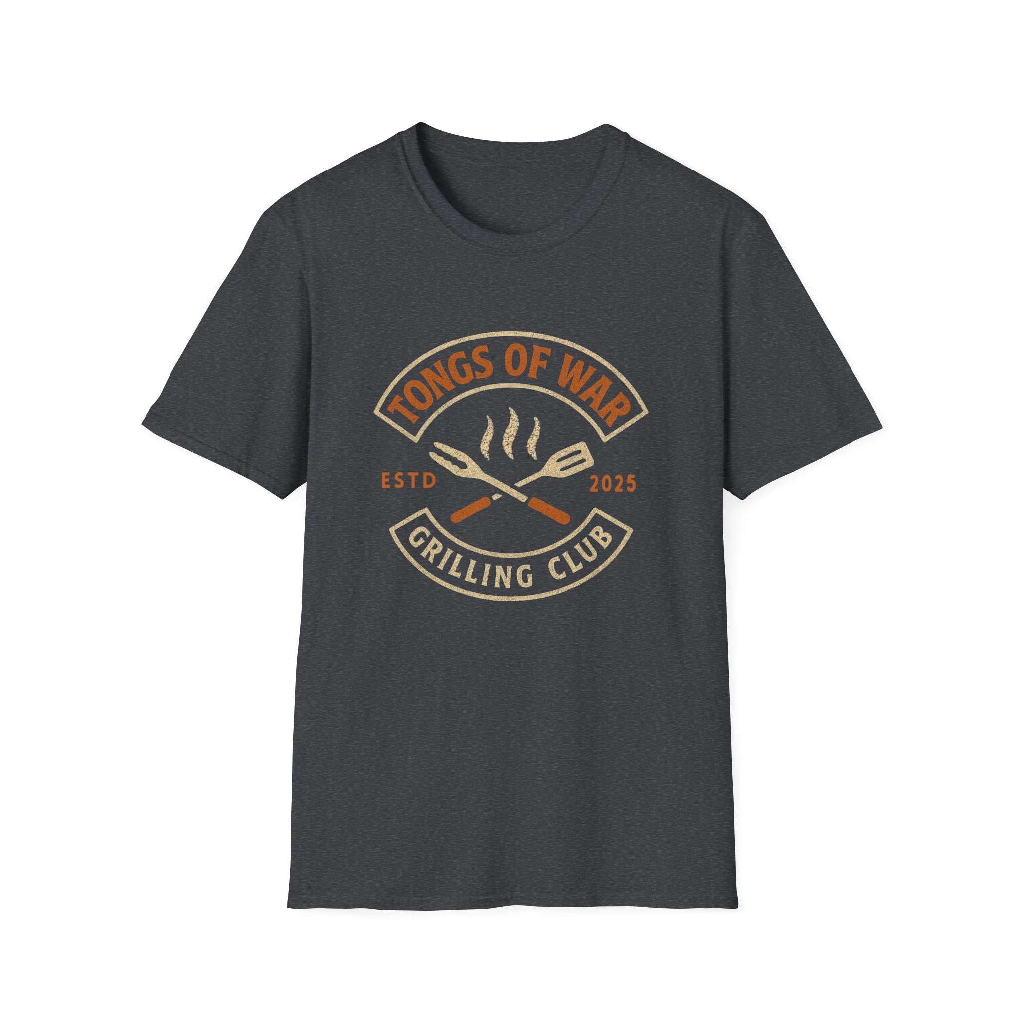 Lightweight and breathable, this crew-neck tee carries a warm, backyard-grill energy: a retro emblem reading “Tongs of War — Grilling Club” sits over crossed spatula and tong icons with gentle steam lines. The soft ring-spun cotton feels smooth against the skin and drapes casually for relaxed weekends by the smoker or evening cookouts. Subtle vintage tones in the print give it an effortless, lived-in look while the tear-away label and stable shoulder tape keep it comfortable through long summer hangs. Wear it to rounds of burgers and ribs, to neighborhood cookoffs, or when you need a reliable tee that quietly announces you take your grilling seriously.